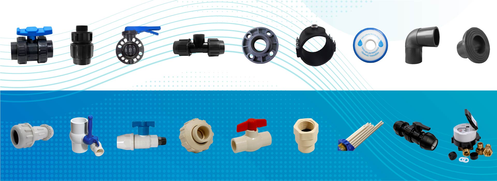 Importamos y comercializamos valvulería para control de agua, accesorios rápidos para polietileno, cinta teflón, productos químicos para tratamiento de aguas y elementos para medición de agua. Las válvulas y los medidores son elementos indispensables para el montaje de estructuras conductoras y retenedoras de aguas como piscinas, acueductos y tuberías de riego; por ello ofrecemos productos de alta calidad con una amplia garantía de tres años.